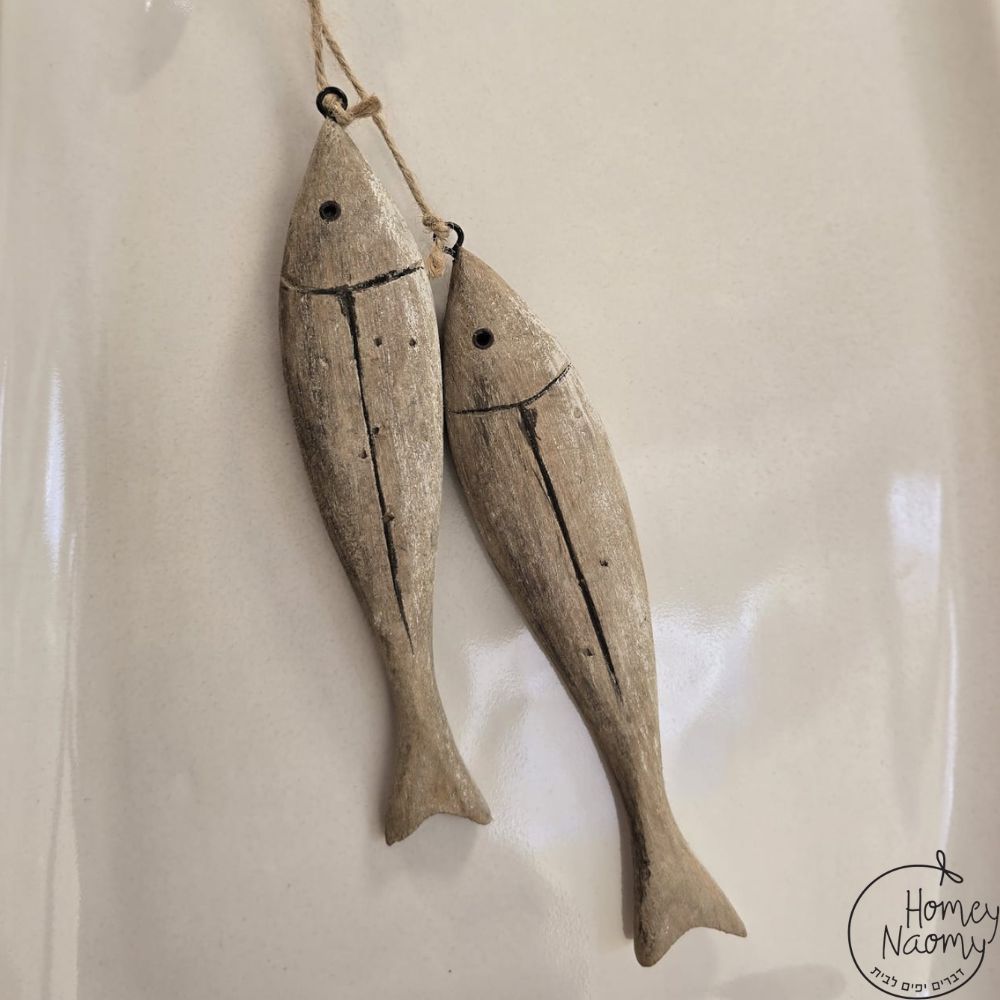 זוג דגים מעץ בעיצוב טבעי ומיוחד קשורים יחדיו בחוט לתלייה וקישוט הבית או החוץ אורך: כ- 15 ס”מ